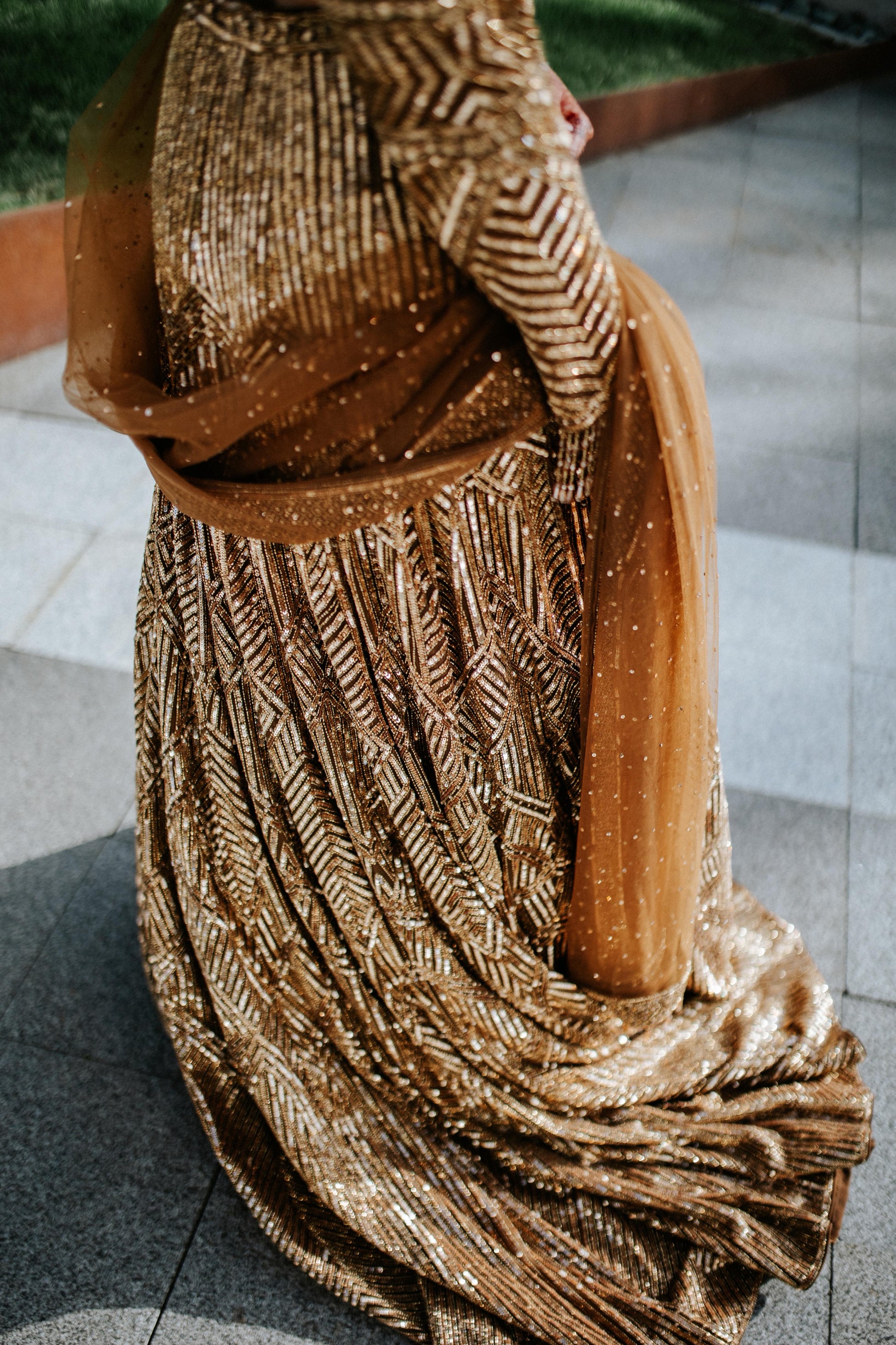 A stunning gold sequin lehenga designed to dazzle under every light. Crafted from luxurious fabric with intricate geometric embroidery and hand embellishments, this piece exudes modern opulence. The open-back blouse adds a bold, contemporary edge, balanced by a sheer dupatta delicately adorned with sequin accents. Perfect for a reception look that commands attention with elegance, confidence, and timeless glamour.