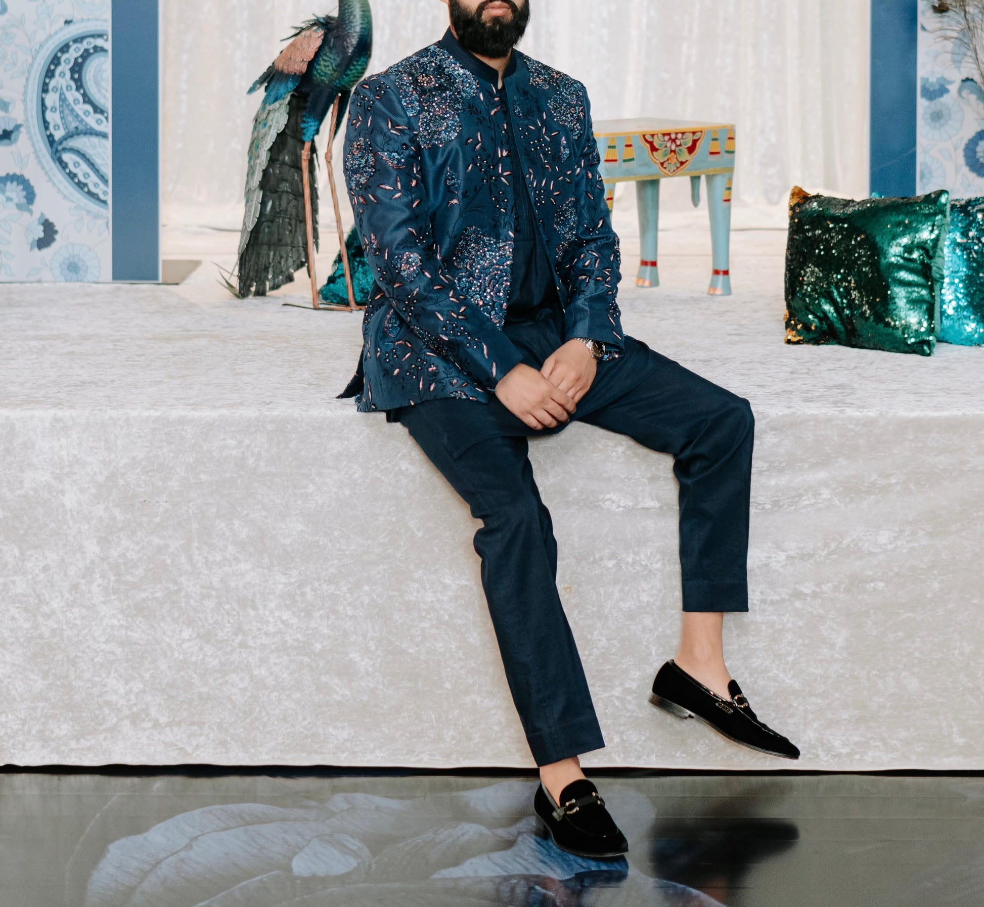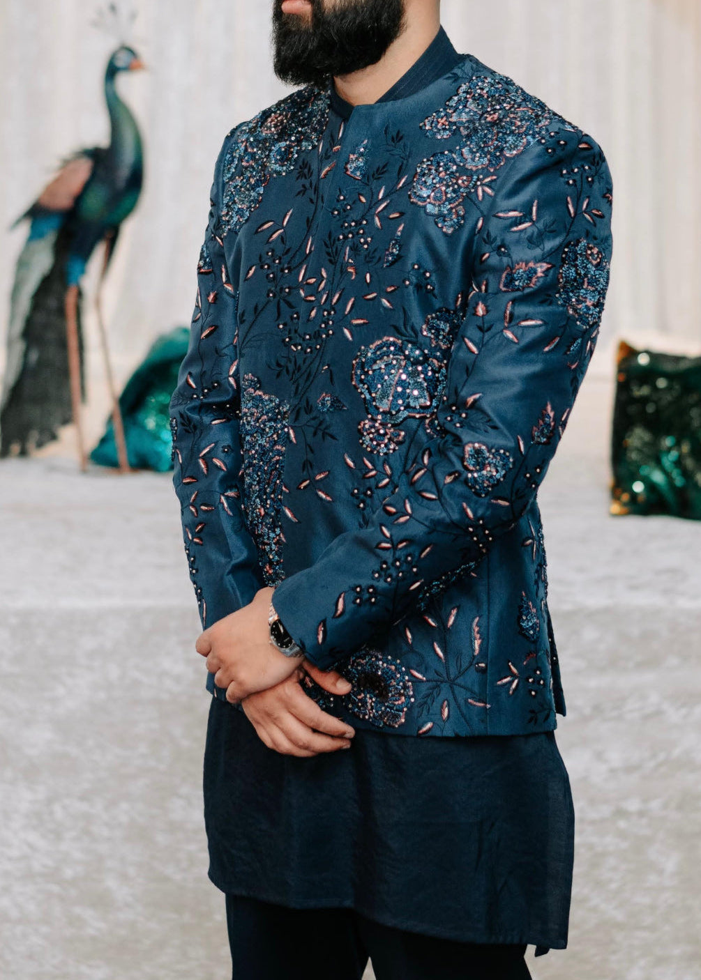Midnight blue silk jacket intricately hand-embroidered with tonal and metallic threadwork, sequins, and bead embellishments in floral and abstract motifs. Paired with a classic navy kurta and trousers, this ensemble blends modern sophistication with traditional artistry