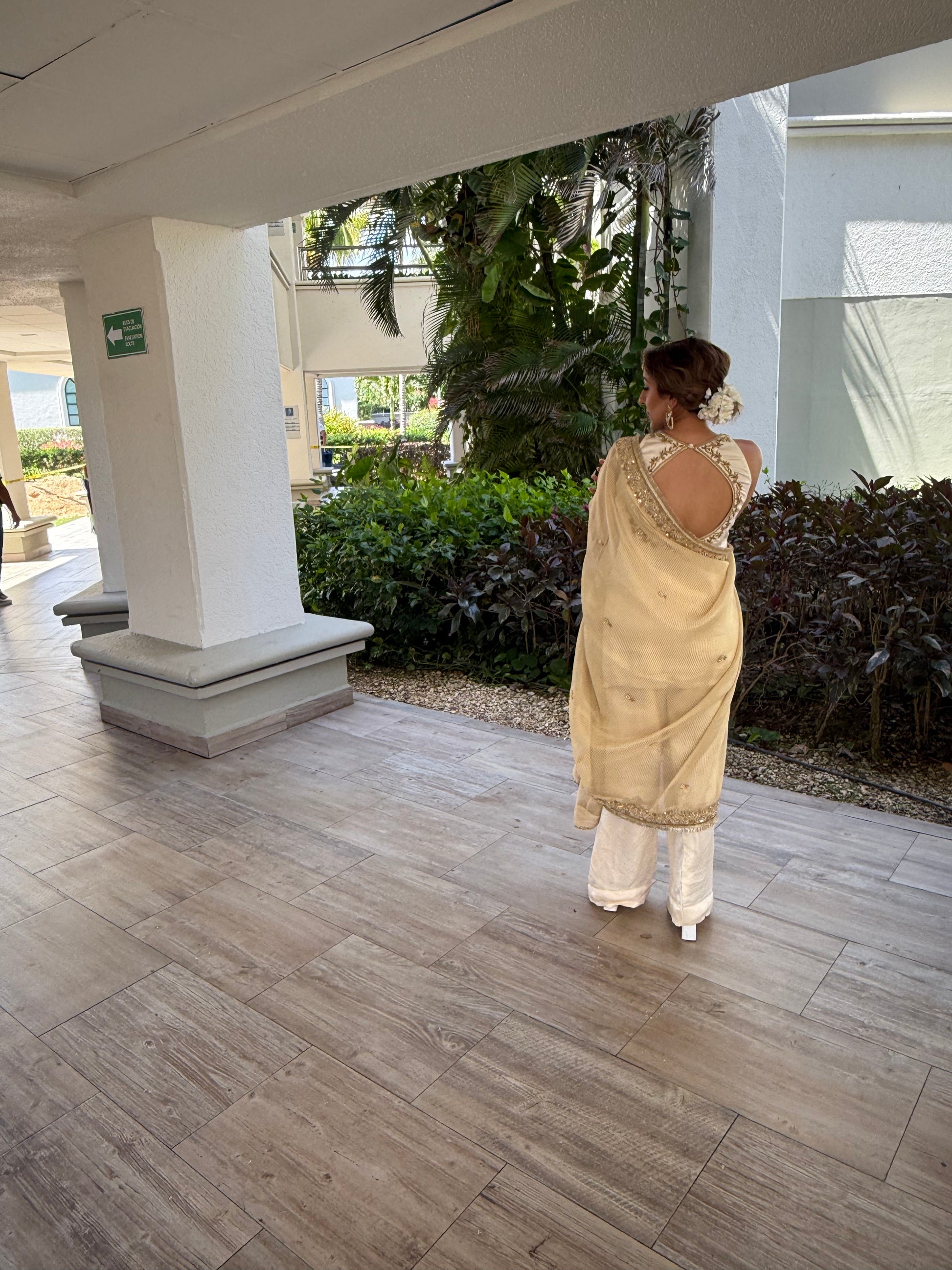 Elegant ivory and gold straight-cut suit crafted from luxurious satin silk. Features intricate gold embroidery along the neckline and hem, complemented by a shimmering tissue embroidered dupatta that drapes gracefully.