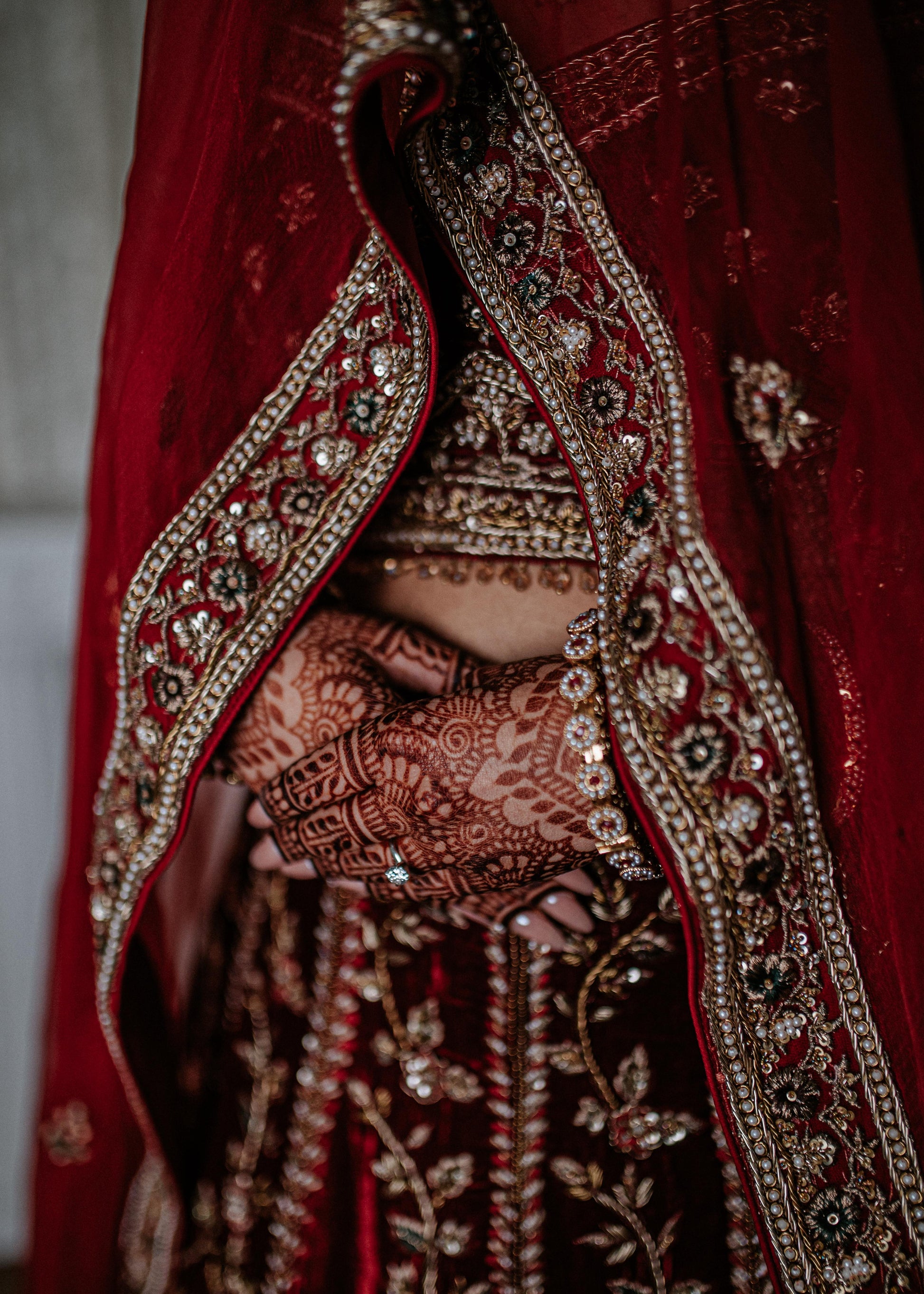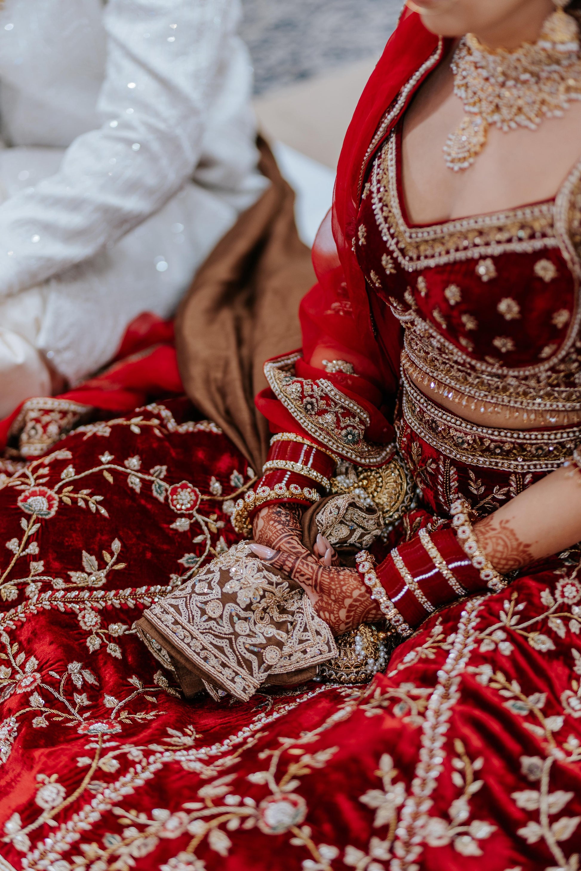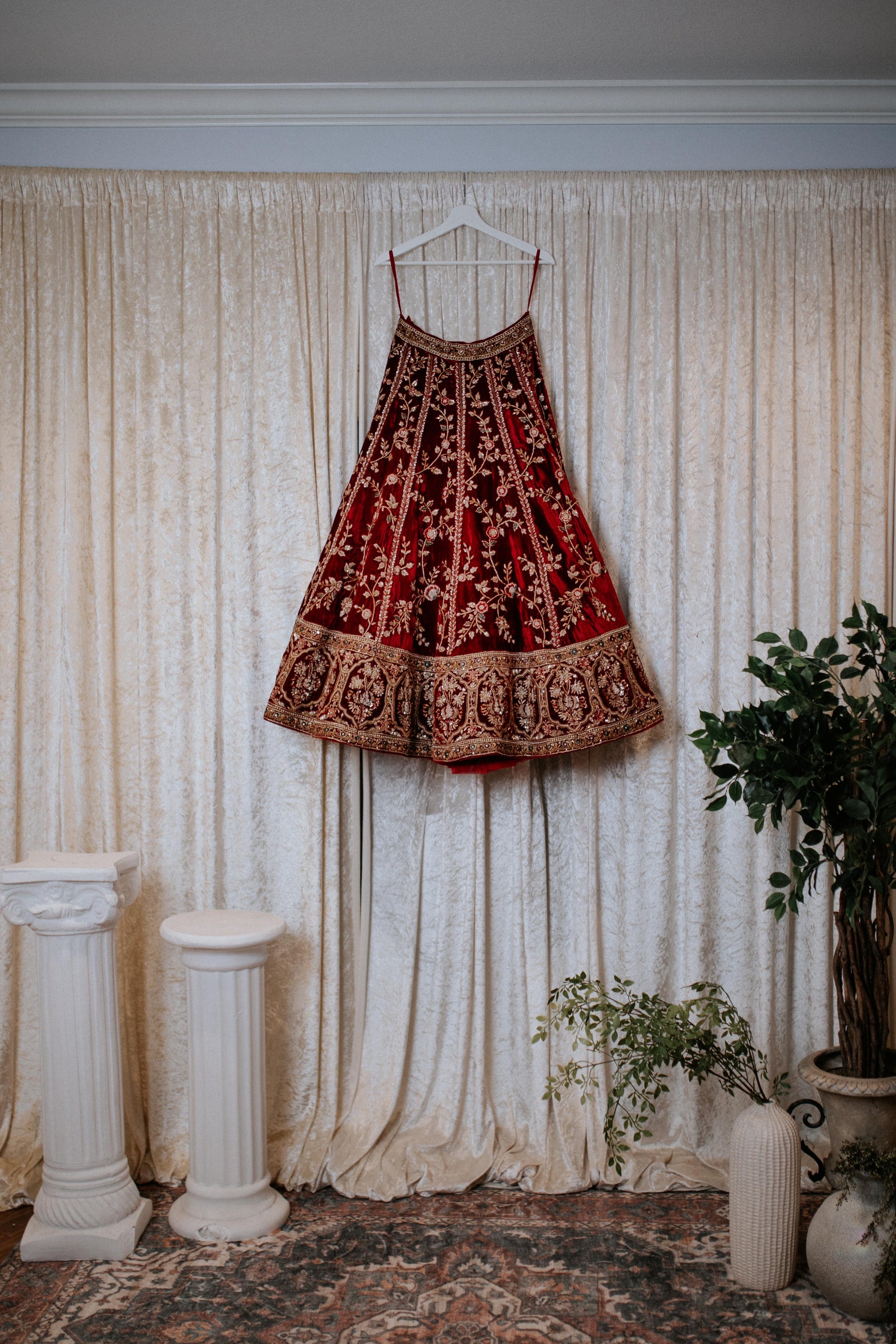 This exquisite velvet red lengha, adorned with intricate handwork, is an elegant choice for brides seeking timeless beauty. The rich velvet fabric provides a luxurious feel and regal look, while the detailed craftsmanship adds delicate artistry that enhances every celebration. Perfectly tailored to embody tradition with a sophisticated touch, this lengha promises to make your special day unforgettable.